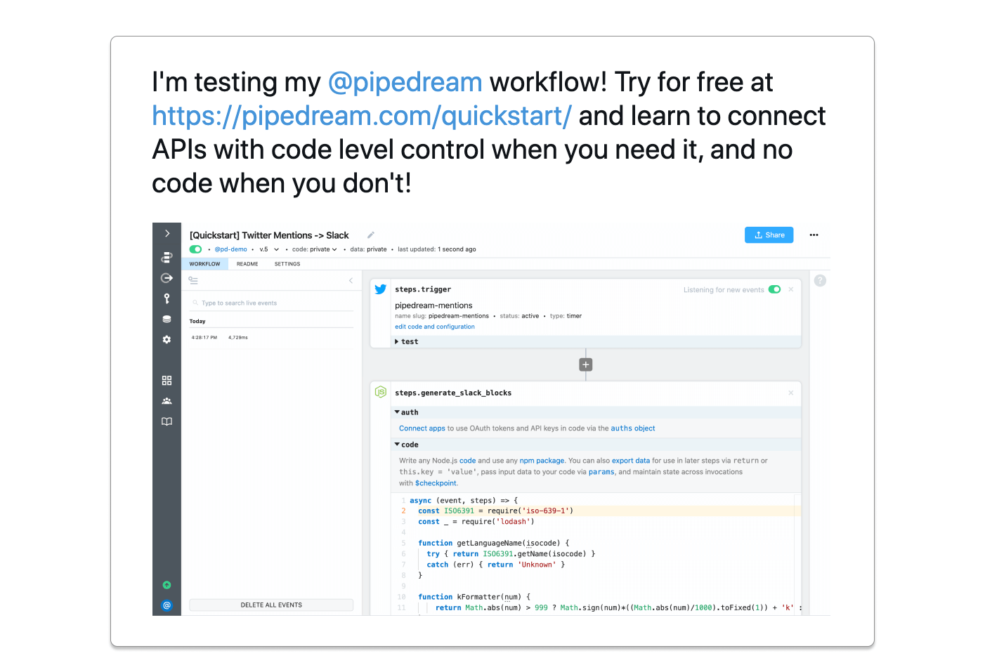 - Trigger a workflow anytime @pipedream is mentioned on Twitter